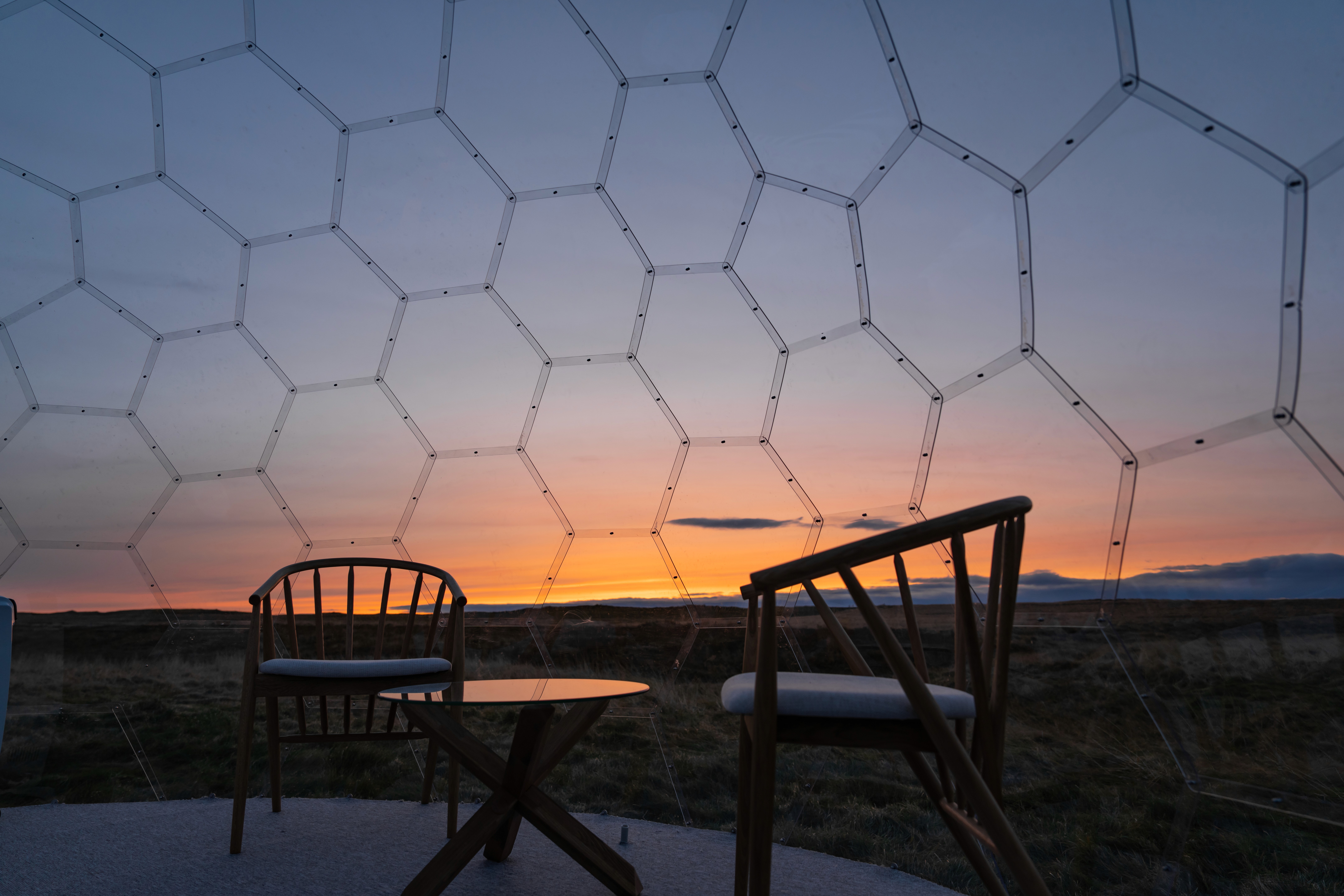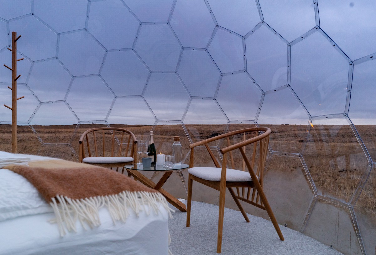 Each dome includes a double bed, heating, and a seating area. The transparent design allows for sky and landscape views, while curtains and a separating wall between domes ensure privacy when needed.